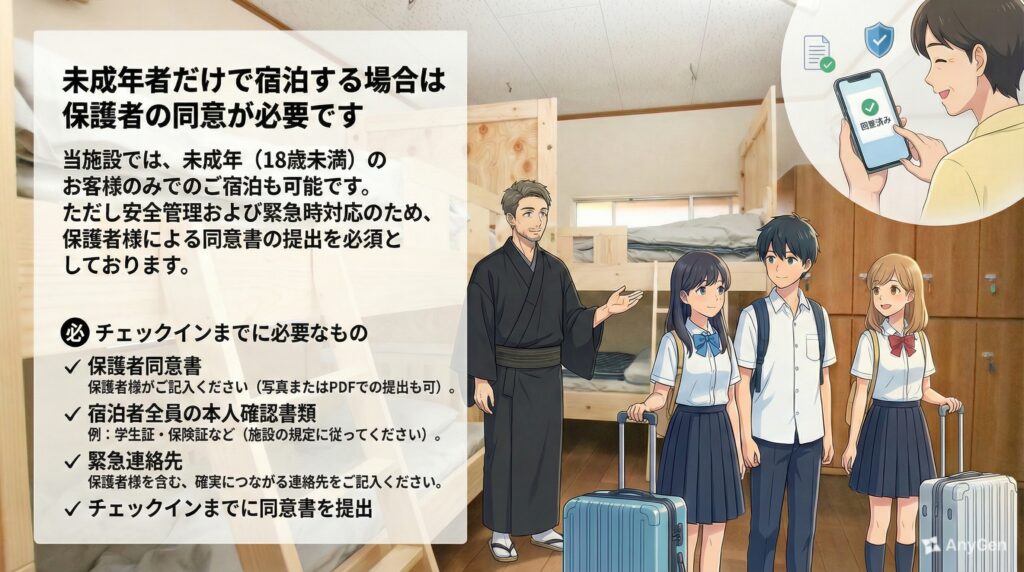 未成年のみで宿泊される場合、チェックインまでに以下をご提出ください。